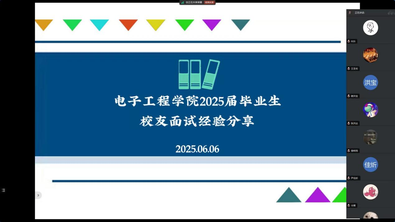 为帮助2025届毕业生积累面试实战经验,缓解求职压力,提高面试通过率,2025年6月6日,电子工程学院通过腾讯会议线上形式举办了一场干货满满的面试经验分享专题讲座。本次讲座特别邀请到学院优秀校友中石油公司庞正红担任分享嘉宾,学院党委书记王圣宏主持讲座,2025届本科及硕士毕业生到场聆听学习。此次讲座旨在搭建校友与学弟学妹的沟通桥梁,通过过来人的实战经验分享,为毕业生求职面试保驾护航,充分体现了学院对毕业生就业工作的重视以及与校友间深厚的情谊和良好合作关系。
