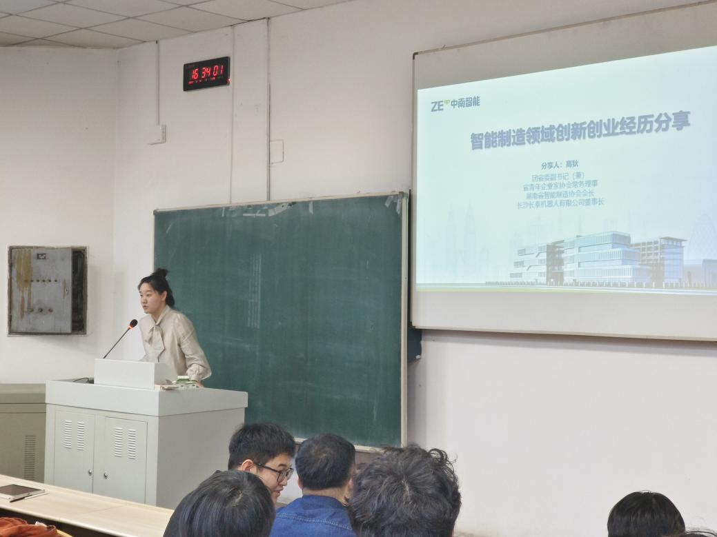 2026年3月4日,中南智能董事、党总支委员,长沙长泰机器人董事长高狄应邀来访,在1号楼为学院本硕应届毕业生开展题为“智能制造领域创新创业经历分享”的专题讲座。学院本硕毕业年级辅导员与学生共同参会,学习高狄董事长的创业经验,了解当前就业市场的前沿信息。