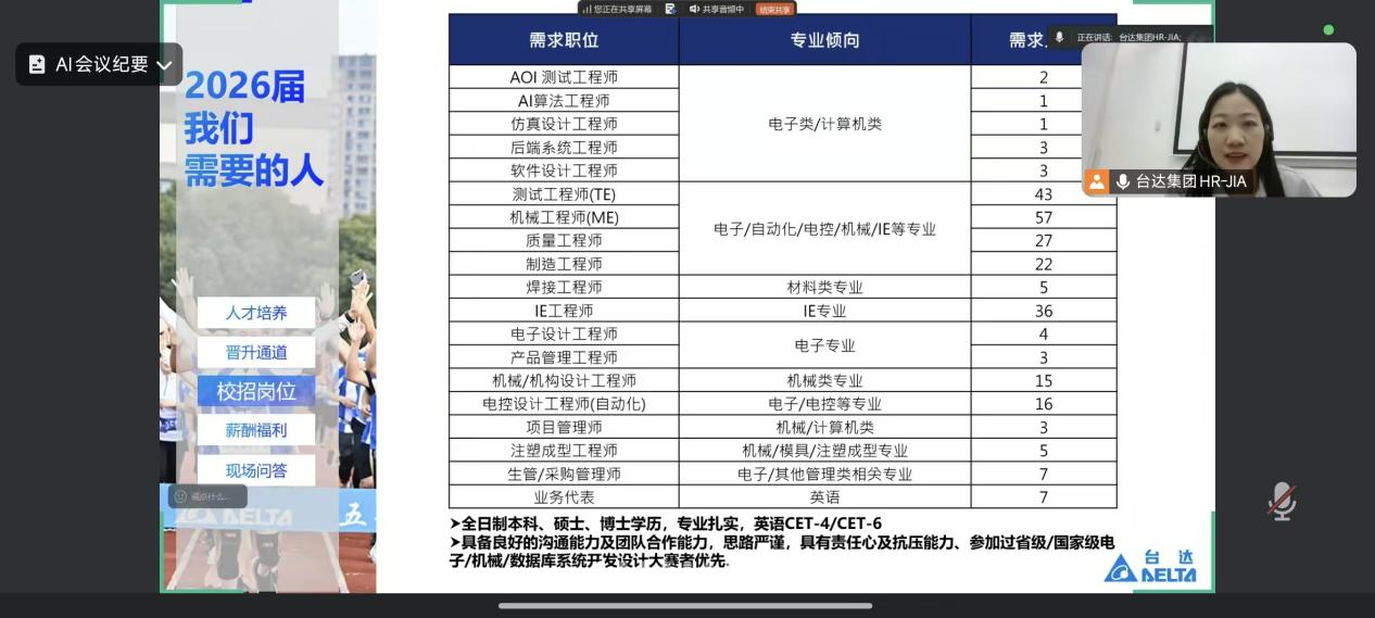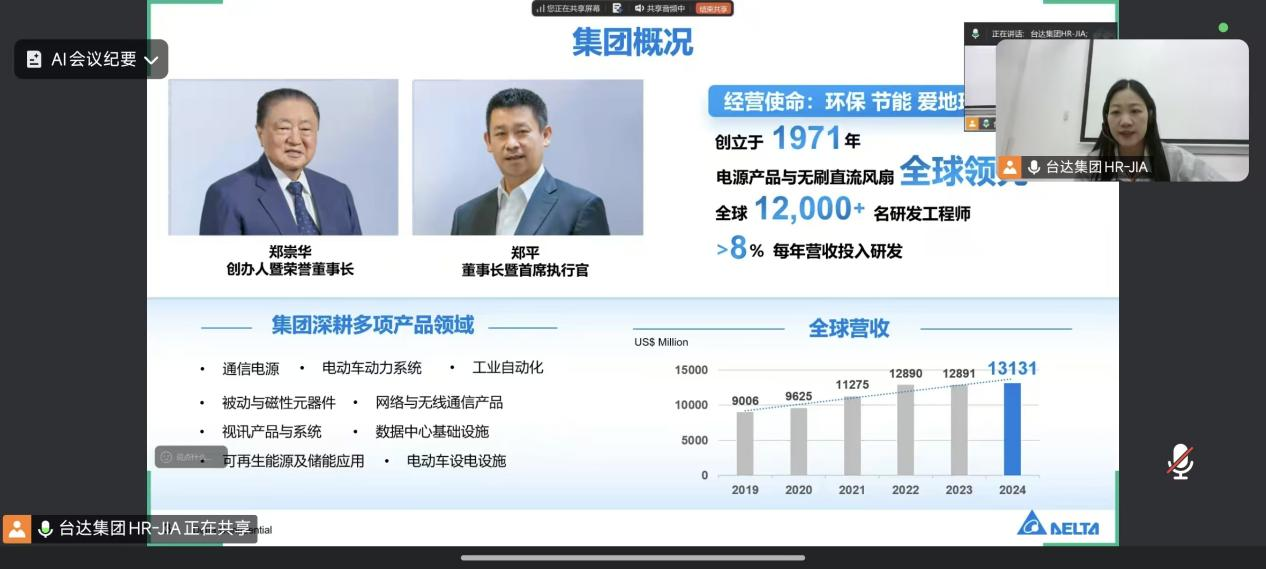 为进一步畅通2026届毕业生就业渠道,推动校企人才精准匹配,,学院于2025年10月21日携手台达电子公司举办2026届毕业生线上专场宣讲会。台达电子公司招聘负责人、学院2026届本硕毕业生参与此次宣讲会,会议由台达集团HR主持。