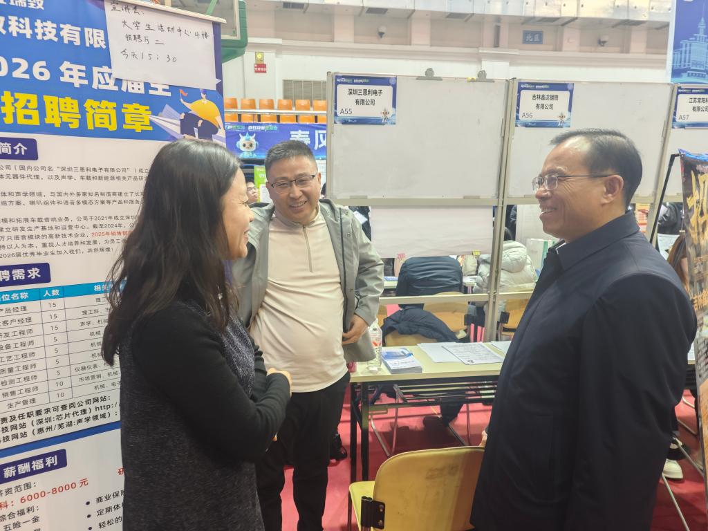 为进一步深化校企合作、拓宽毕业生就业渠道,2026年3月23日上午,学院党委书记王圣宏、院长王尔馥、党委副书记于海涛、副院长刘明亮、副院长吴文智及全体毕业班辅导员老师共同前往体育馆春季招聘会现场开展企业对接工作,助力学院毕业生顺利就业。