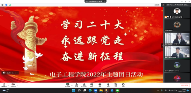 为深入学习宣传贯彻党的二十大精神,积极引导青年学生深刻领会和把握大会的精神实质和丰富内涵,团结带领广大青年学生成长为有理想、敢担当、能吃苦、肯奋斗的新时代好青年,紧跟党奋进新征程。电子工程学院团委积极响应校团委号召,于2022年11月27日13:30以线上形式开展“学习二十大,永远跟党走,奋进新征程”主题团日活动。