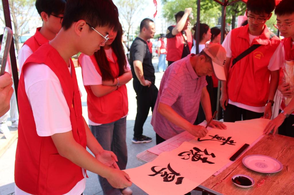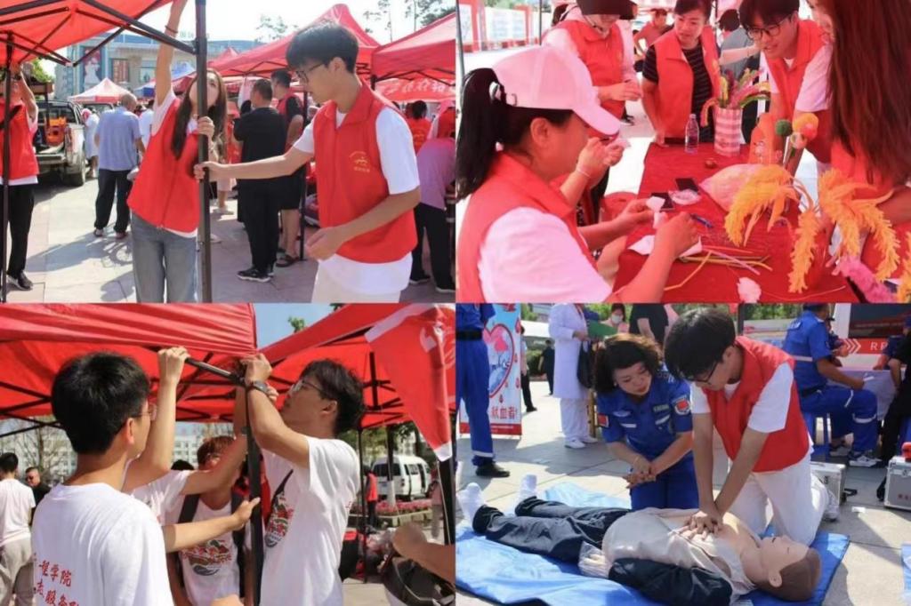 随后,社会实践服务队队员来到富锦市政府广场参加“爱尚锦城,志愿同行”志愿服务活动大集。本次活动设有中老年人免费义诊、防溺水安全知识宣讲、书法交流等多个展位,凝聚志愿服务力量融入基层社会治理,满足群众多样化需求,为群众送健康、送欢乐、送温暖,让广大居民体验到“零距离”的便民服务。活动开始前,队员们积极帮助社区工作人员清理现场、布置场地、搭建帐篷。随后,引导居民有序参加各项活动,并为赶集的群众提供应急救护培训、防灾减灾知识宣讲等多元化服务,吸引了众多市民前来参与。在服务过程中,队员们也学习了手工编织和心肺复苏技巧。队员们用实际行动保障整个活动的顺利进行,提升居民生活幸福感,展现了青年一代的责任与担当。