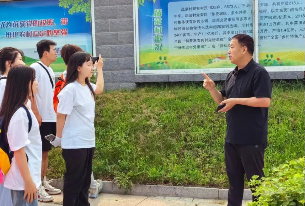 蔬菜村现有村民1935户、6873人,下设6个支部,共有党员218人,村“两委”成员11人。村集体现有新兴市场,蔬菜交易市场等多家企业,资产积累3亿多元。2018年蔬菜村发展壮大村级集体经济经验做法入选中组部案例选编。全村现有耕地1.3万亩,其中菜田面积6500多亩,棚室面积3400多亩,年产1.1亿多斤,产值1.4亿元,人均收入2.9万元。先后获评全国“科普惠农兴村先进单位”全国“乡村治理模范村”全国“乡村特色产业亿元村”、黑龙江省“五个好先进村党组织”、省“劳动模范集体”等荣誉。蔬菜村党组织书记窦乃兴带领同学们参观蔬菜村,详细介绍了蔬菜村的发展、近年来取得的成果以及蔬菜的销售情况,同学们深入了解蔬菜村的发展运营模式。随后,窦书记和同学们一同进入大棚蔬菜种植地的空中观测台,参观蔬菜村大棚蔬菜的种植范围,并且了解蔬菜村大棚蔬菜种植的分布情况。