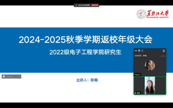 奋斗新起点,启航新学期。为切实做好研究生新学期返校工作,帮助同学们建立新学期学习规划。2024年8月26日,学院以线上线下相结合的方式召开2024-2025学年秋季学期年级大会,学院研究生辅导员高武扬、耿畅主持会议,2022级、2023级全体研究生参加会议。