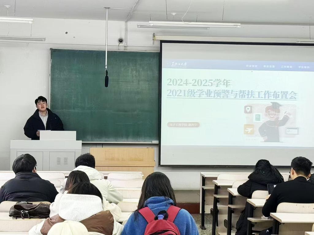 为进一步强化学院学风建设,引导学生端正学习态度,做好学业困难学生的教育、引导工作,电子工程学院各年级于2024年10月25日-11月7日期间召开了2024-2025学年第一学期学业预警及学业帮扶工作布置会,会议由各年级辅导员主持,全体学业预警学生参加本次会议。