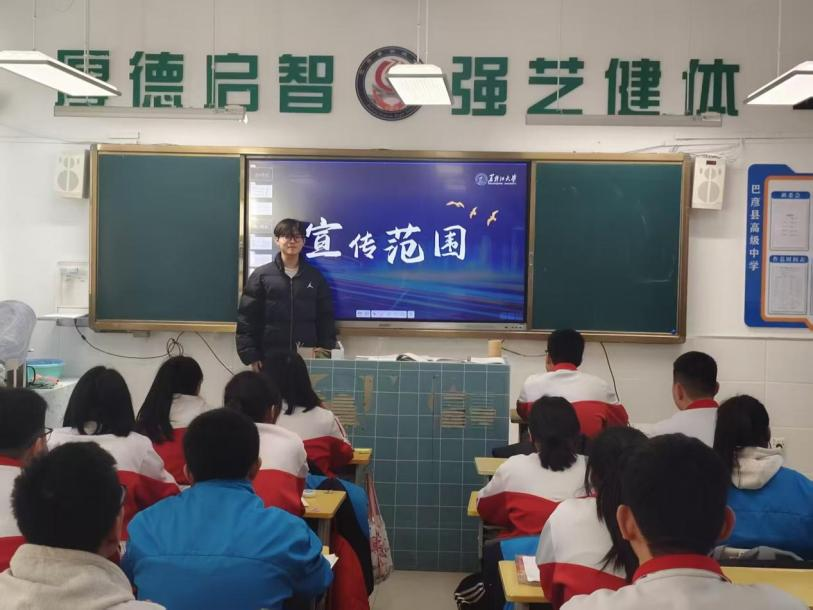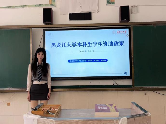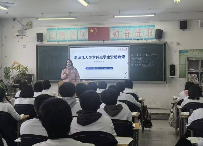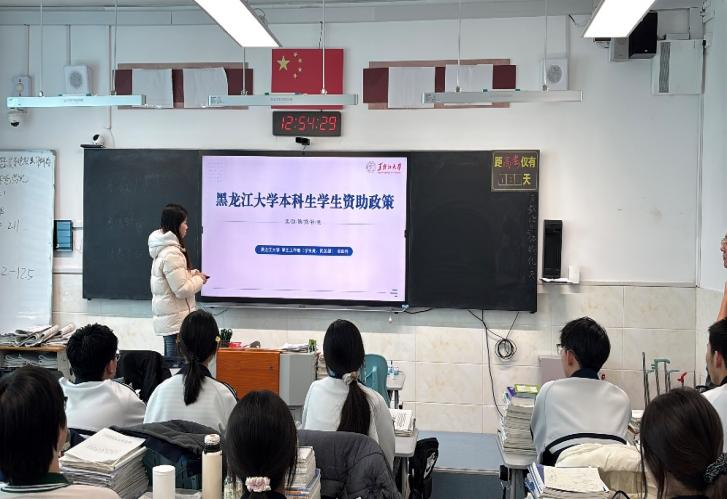 2026年1月21日,宣传团队来到哈尔滨市巴彦高级中学,刘一博作为团队牵头人,首先向巴彦高级中学师生说明活动背景与目的,明确本次宣传是响应学校寒假资助政策宣传教育活动号召,旨在传递国家与学校对家庭经济困难学生的关怀,消除升学费用顾虑。她统筹整场活动流程,简要介绍团队分工及活动安排,强调“不让一名学生因家庭经济困难失学”的政策底线。随后,她组织现场播放了黑龙江大学资助育人主题视频,视频中收录了校内优秀受助学子的成长故事、各类资助政策的实景解读,以及勤工助学、公益帮扶等资助育人场景,以直观生动的形式,让同学们提前感受到高校资助工作的温度与力度,为后续政策宣讲奠定了情感基础。