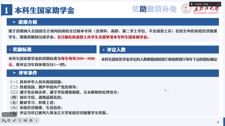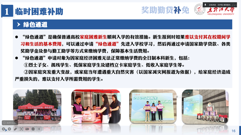2026年2月3日,为打破地域限制,实现政策宣传的全覆盖,冯宇恒同学创新宣传形式,以腾讯会议的方式开展线上资助政策宣传,面向同乡已经上大学或即将上大学的学生及家长,围绕“感恩,诚信,责任,奉献”核心,结合自身连续三年获得国家助学金的经历,分享参与志愿服务、社会实践等公益活动的感悟与收获,在讲解国家资助政策的同时,还以亲身经历为榜样,鼓励更多青年学生奋发向上,传递出自强不息、懂得感恩、乐于奉献的正能量,把资助与育人更好地结合起来,深化了资助育人的实际成效。