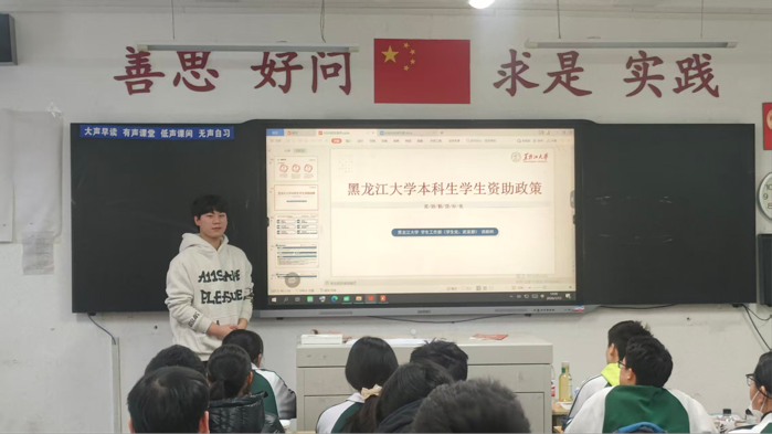2026年1月12日,高松禹同学前往哈尔滨市第十四中学,以演讲为主要形式,全方位讲解黑龙江大学本科生学生资助政策,系统解读“奖、助、贷、勤、补、免”六大政策核心内容,将国家奖学金、国家励志奖学金、综合奖学金等奖励政策,国家助学金、助学贷款等帮扶政策的申请条件、评定标准、资助额度清晰传递给高中师生,同时结合自身成长经历激励同学们明确升学目标、奋发向上。