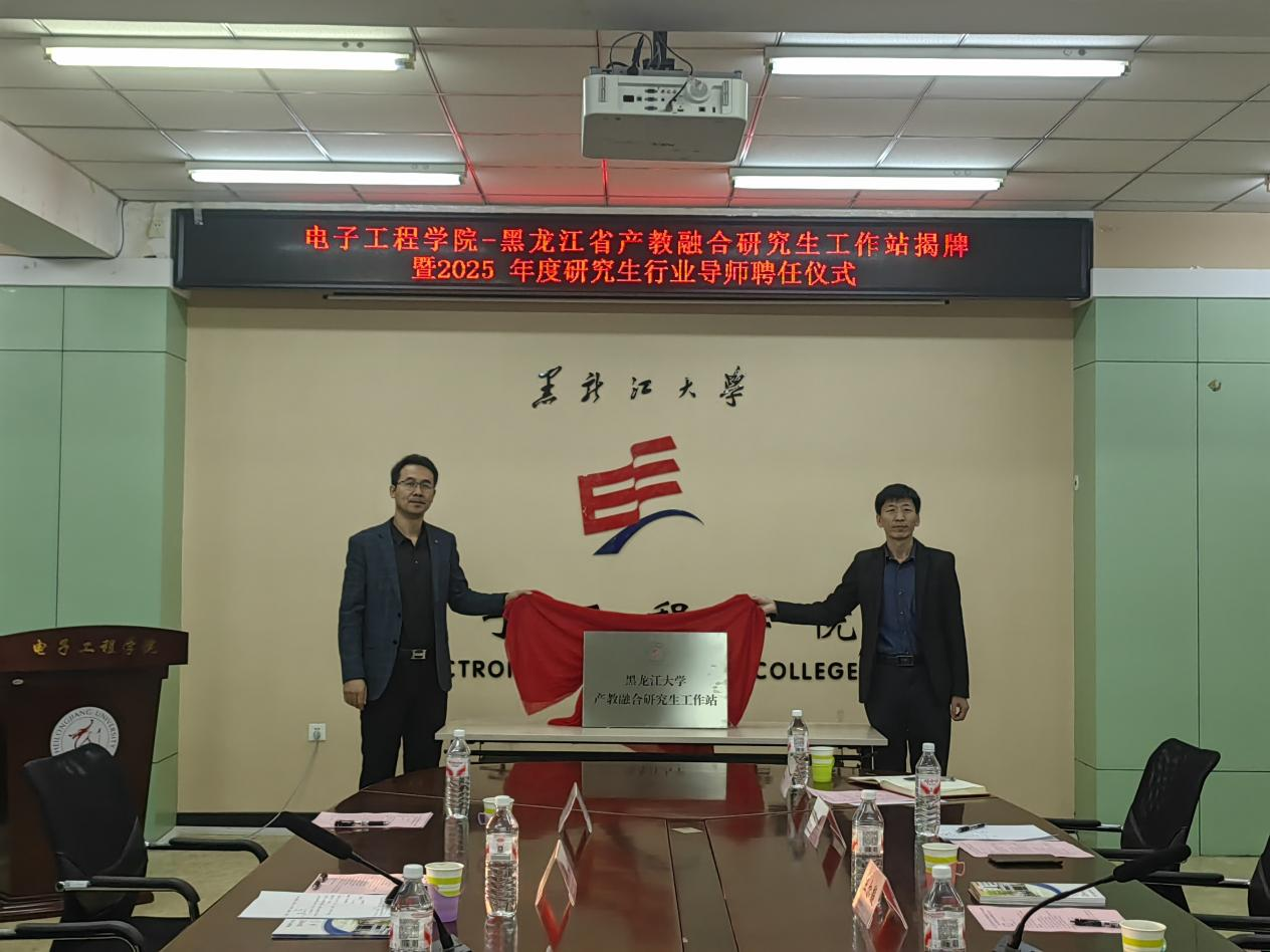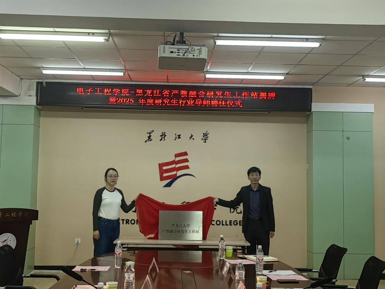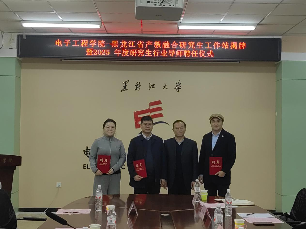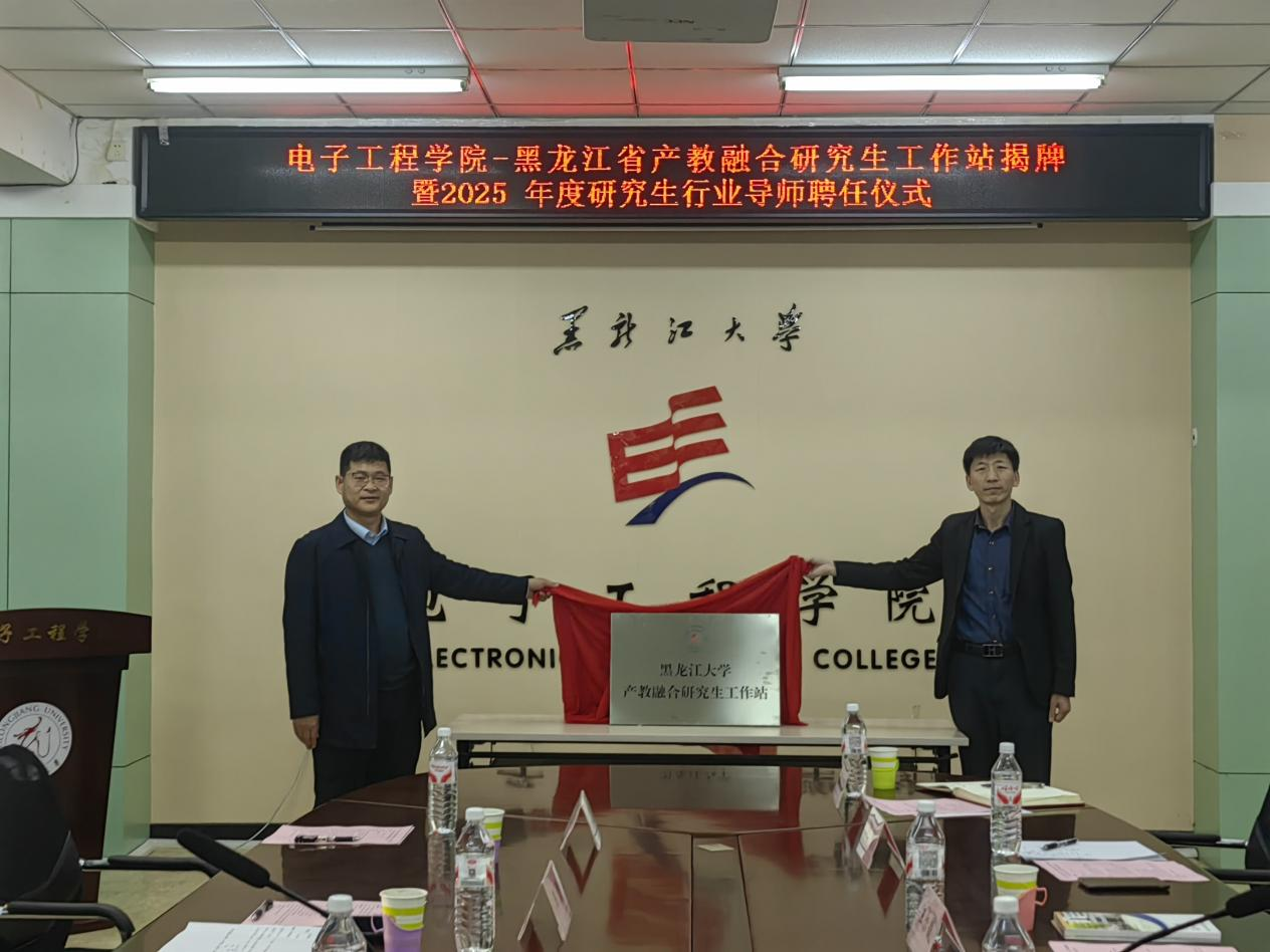 在揭牌仪式环节,研究生院副院长刘义波与三家企业负责人共同为“电子工程学院-黑龙江省产教融合研究生工作站”揭牌,标志着这一重要合作平台正式启动运行。