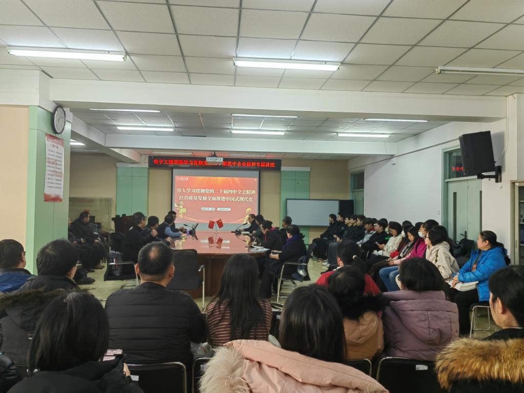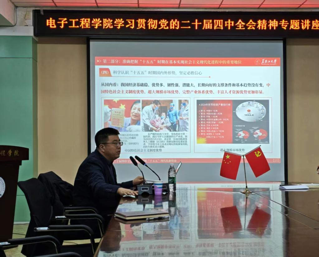 为深入学习贯彻党的二十届四中全会精神,将全会部署与电子信息领域发展实践深度融合,引导师生在科技强国建设中锚定方向、勇毅前行,2025年12月17日下午,电子工程学院特邀马克思主义学院院长、博士生导师王秋教授在实验楼315会议室举办党的二十届四中全会精神专题讲座。学院领导班子、全体教师、学生代表参加,本次讲座由学院党委书记王圣宏主持。