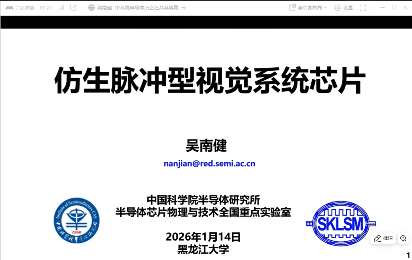 2026年1月14日14点,我院邀请中国科学院半导体研究所吴南健研究员作报告。讲座聚焦边端智能视觉芯片的发展瓶颈。吴南健研究员指出,传统芯片在处理多比特实数信息时面临数据量大、计算复杂、功耗高等挑战。为此,他重点介绍了仿生脉冲视觉芯片的创新思路:通过集成单光子脉冲图像传感器与可重构脉冲处理器,利用单光子雪崩器件直接产生脉冲信号并耦合脉冲神经网络计算,实现视觉信息获取、处理与传输的全链路“脉冲化”,为突破现有技术限制提供了新路径。