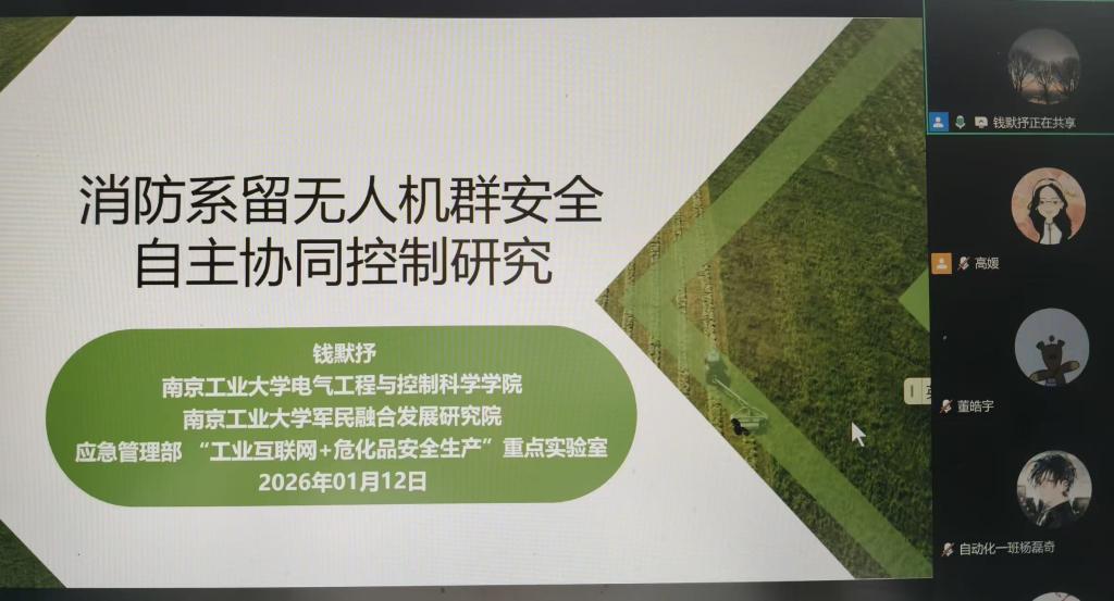 2026年1月12日14点,我院邀请南京工业大学钱默抒教授作报告。钱默抒教授围绕应急救援场景中消防系留无人机群所面临的空域约束(如管线缠绕)和时域约束(如通信带宽限制)等问题,系统阐述了系留无人机群的动力学建模方法、多尺度威胁下的集群协同避撞策略,以及典型火灾场景中机群自主协同控制与性能优化方法,并结合多个无人机灭火实景视频,展示了团队最新的研究进展与应用成果,有效拓宽了学生们的科研视野。本场报告作为学术周系列活动的重要组成部分,生动展现了控制领域前沿科技对人民生活产生的深远影响,有效激发了同学们科技报国、服务社会的理想与热情。