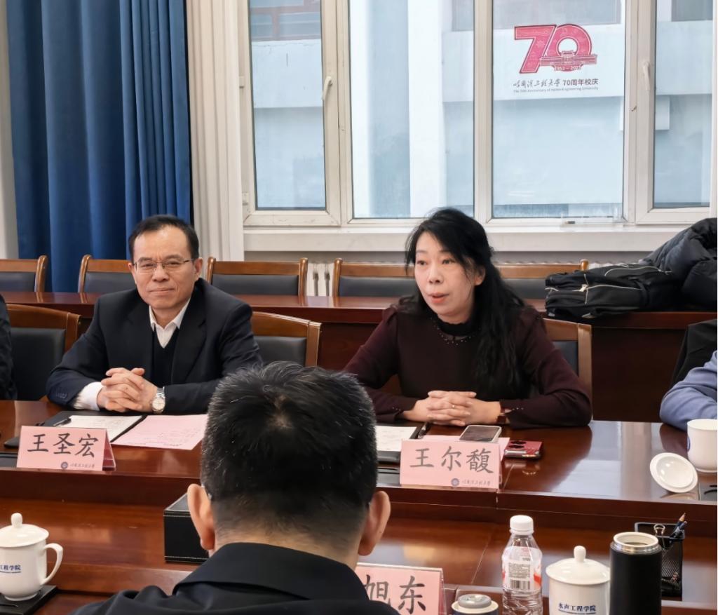 调研团队首先参观了水声技术全国重点实验室。在座谈会上,哈尔滨工程大学水声工程学院乔钢院长介绍了学院的发展历程、学科布局与核心优势。随后,黑龙江大学电子工程学院王尔馥院长对水声工程学院的热情接待表示感谢,并详细介绍了黑龙江大学电子工程学院的基本情况。她指出,电子工程学院立足电子信息学科群,深耕智能传感、智能控制、寒区智慧农业装备等领域,此次调研旨在借鉴水声工程学院在学科建设、科研攻关、成果转化等方面的先进经验,寻求双方在跨学科领域的合作契合点,推动学院高质量发展。