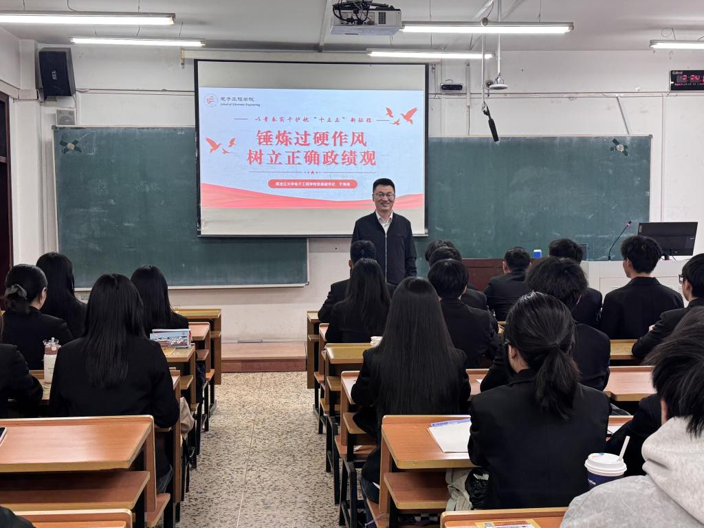 学院团委书记谢洪宝围绕全国教育大会精神、《教育强国建设规划纲要》为学员们作了专题学习辅导,他激励电子工程学院的预备党员们立足专业、奋发有为,为教育强国和学校发展贡献力量。